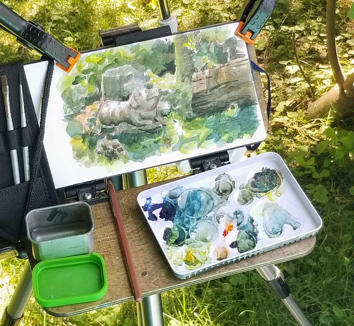 My Gurney easel is compact and suitable for small watercolor sketchbooks; the brushes, water, paints, and palette are all located within a condensed area near the painting.