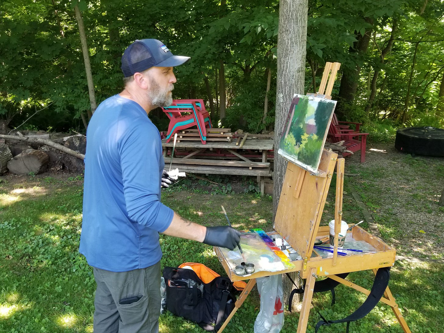Aaron Thompson, a painter friend who teaches at Pennsylvania College of Art and Design and who was a multiple prize-winning artist in this year’s Plein Air West Reading, has a modified French easel with backpacking straps that he bought online. I tried it on, and it was very comfortable! Artists tend to be great problem solvers.
